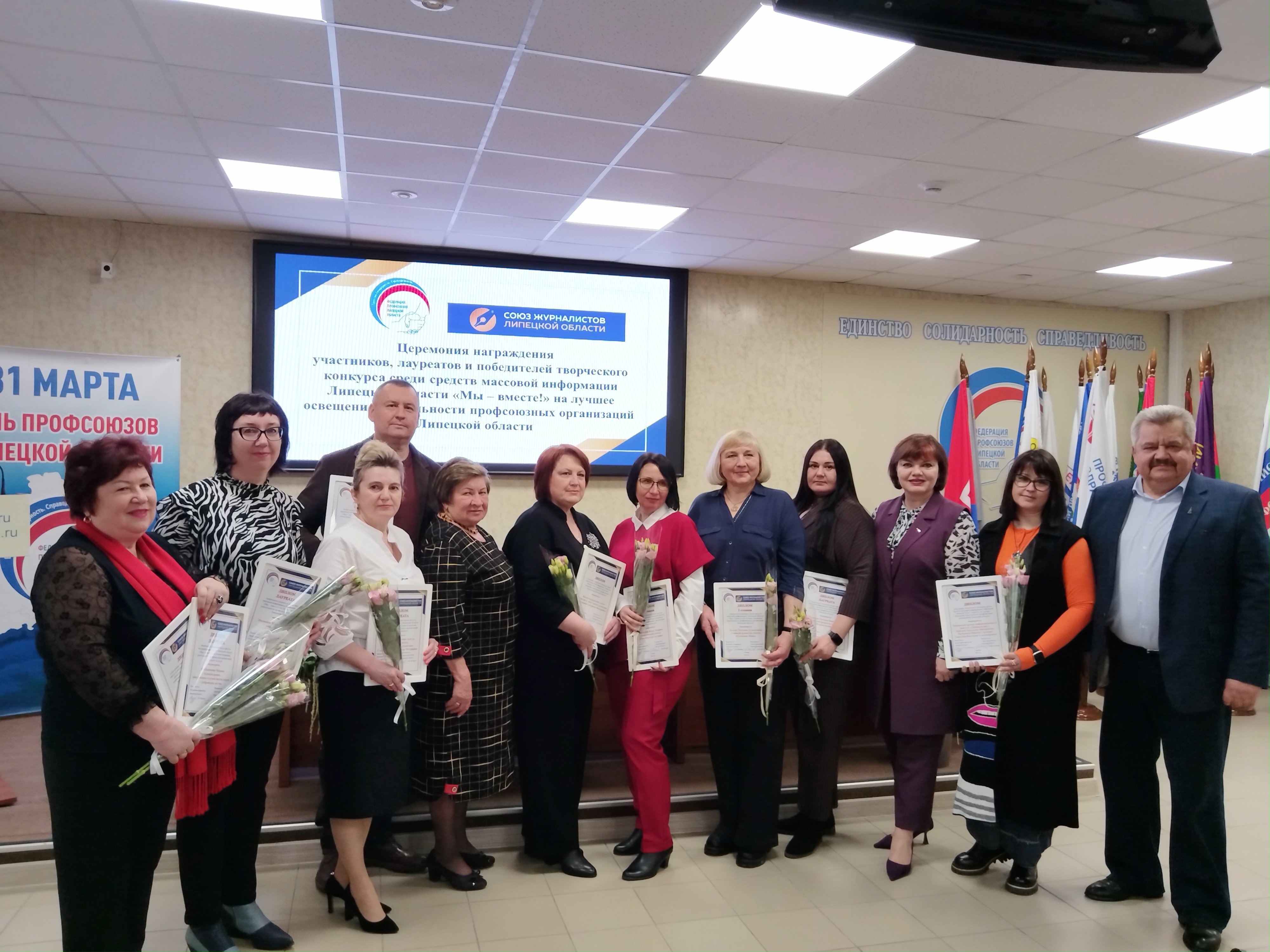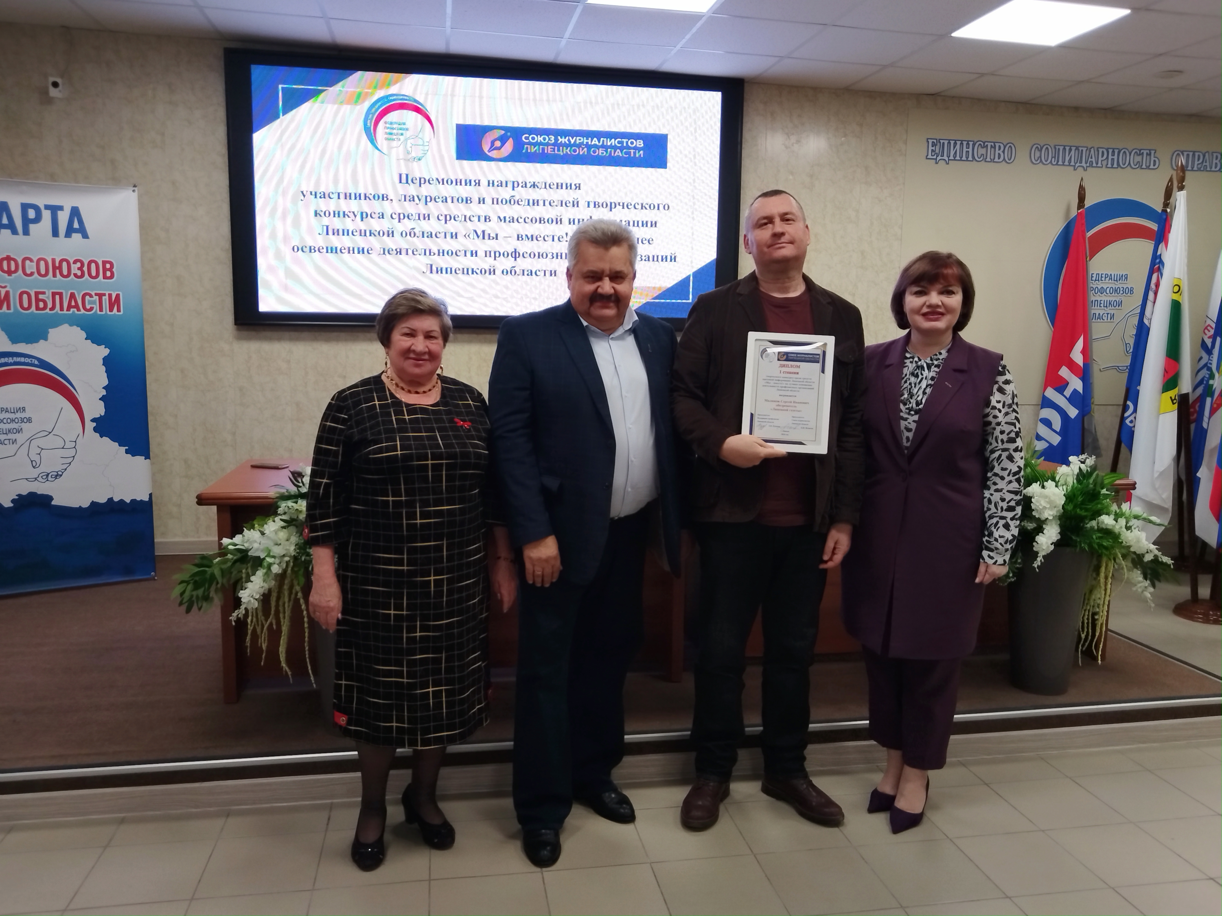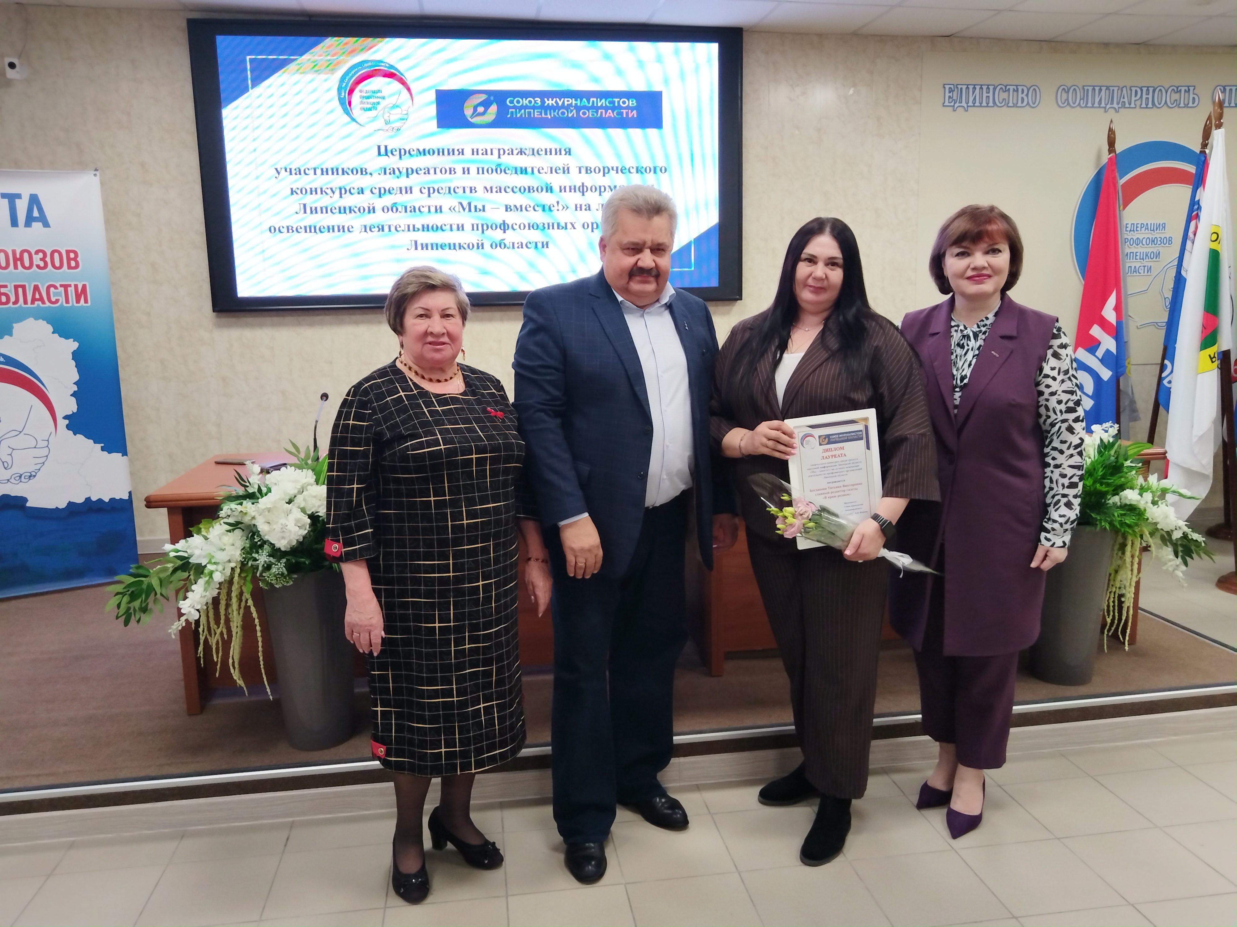Церемонию награждения победителей конкурса провели Председатель Федерации профсоюзов Липецкой области Лариса Кудаева, Председатель Липецкого отделения Союза журналистов России Пётр Игнатов и Председатель Липецкой областной организации Общероссийского Профессионального союза работников культуры Клавдия Копенкина.